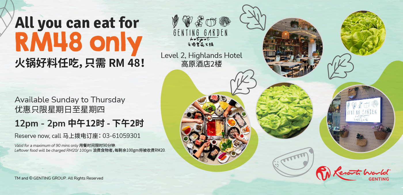 Tự hào được điều hành bởi Resorts World Genting, nhà hàng của chúng tôi mang đến trải nghiệm ăn lẩu độc đáo trên đỉnh đồi. Chọn từ tám loại nước dùng khác nhau được làm từ các nguyên liệu chất lượng và một loại ấn tượng gồm các miếng thịt cao cấp, thịt viên thủ công và đĩa hải sản tươi sống. Rau hữu cơ của chúng tôi được thu hoạch từ Nhà kính rất riêng của chúng tôi nằm trong Genting Secret Garden Hotpot.